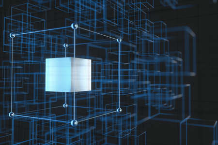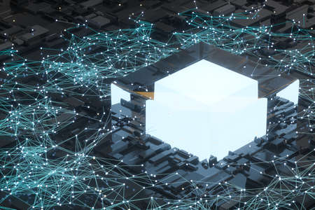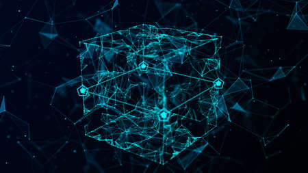 Abstract wireframe cube whith connection dots and lines. Digital blockchain concept and data transfer system. Storage cells of datas. 3d rendering.