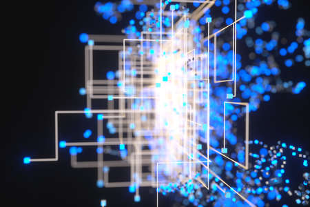 Abstract glowing cubes and lines, circuits and materials, 3d rendering. Computer digital drawing.