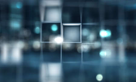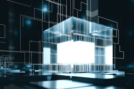Saver for presentations. Technological abstraction of a three dimensional cube and holograms. Blue background with cube. 3D illustration 3D visualization