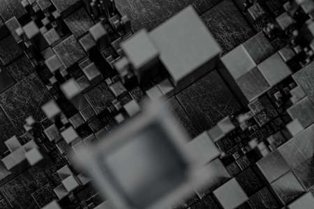 Abstract background from metal cubes with random offset effect. The glass inside the cubes reflects light. 3d illustration