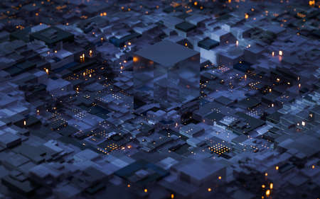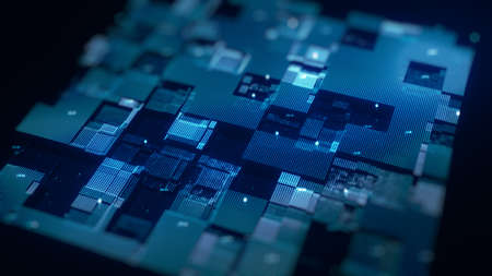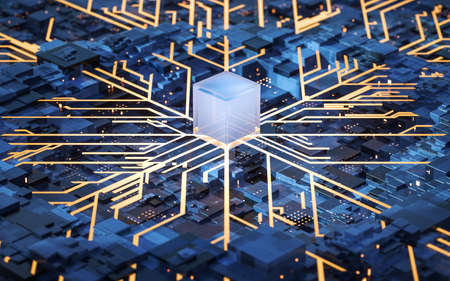 Abstract 3d render of circuit board with glowing cubes. Technology concept