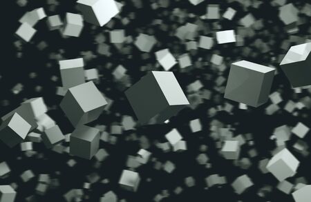 Dark cubes randomly distributed in the air, 3d rendering. Computer digital background.