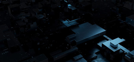 Abstract 3d rendering of chaotic cubes. Blue and black background.