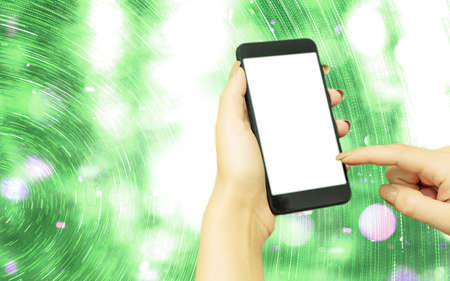 Hand holding smartphone mobile . Mixed media