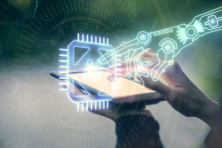 Double exposure of creative artificial Intelligence symbol with finger clicks on a digital tablet on background. Neural networks and machine learning concept