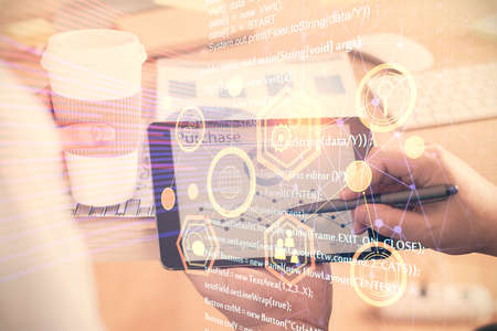 Multi exposure of man's hands holding and using a digital device and data theme drawing. Innovation concept.