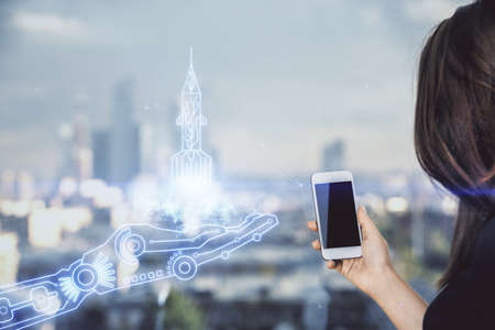Double exposure of creative hologram and woman holding and using a mobile device. Start up concept.