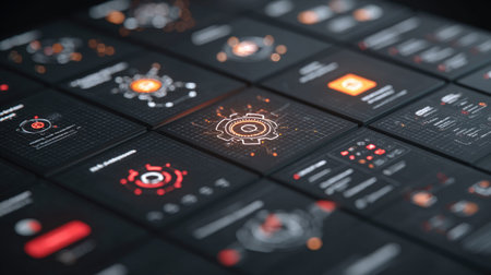 Explore a modern digital interface showcasing glowing graphs and charts on a sleek black background, ideal for technology projects or business presentations.