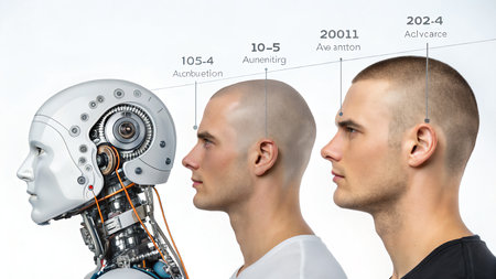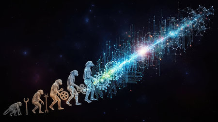 An illustration depicts the evolution of humans, culminating in a connection with technology. The figures progress against a dark backdrop, transitioning from primitive forms to a technologically integrated being. The composition showcases a stylized, conceptual representation, suitable for editorial and commercial applications.