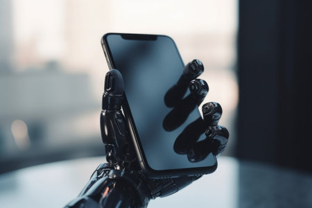 Animatronic hand smartphone. Modern and black robot holds new device. Generate AI