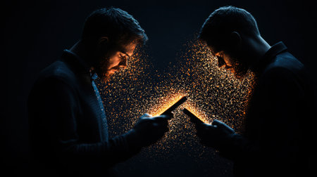 This striking image captures the essence of digital connection, featuring two men with smartphones. Surrounded by shimmering lights and particles, they reflect the modern interaction of technology in a captivating and artistic manner.