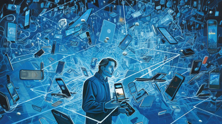 Abstract image of a smartphone with a blue glowing network structure on the screen. The network structure is made up of multiple nodes and connections, representing a complex system or network.