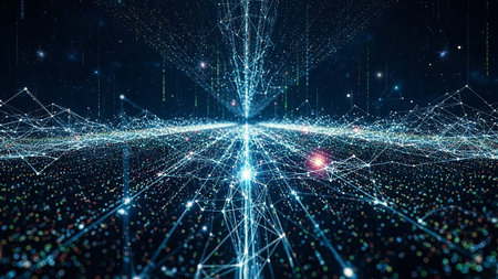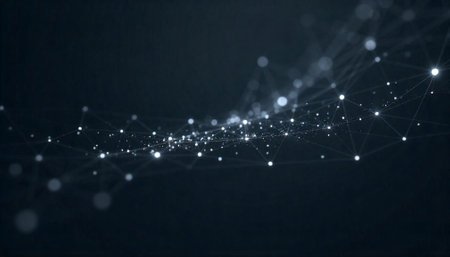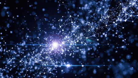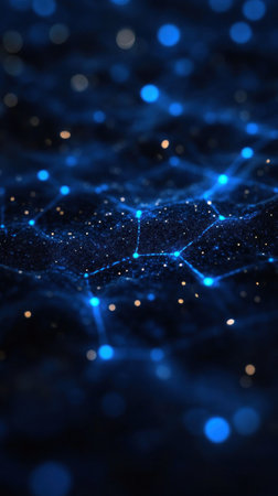 A bright blue web of glowing particles connects in a dark space, creating a feeling of digital depth.