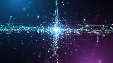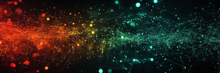 This vibrant digital background features glowing particles and a sophisticated network design, ideal for technology themes and modern presentations, reflecting innovation and contemporary aesthetics
