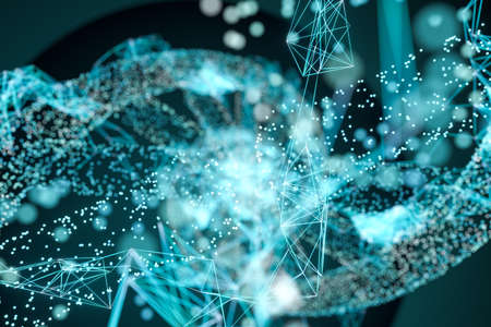 Abstract 3d rendering of chaotic glowing particles. Futuristic background with bokeh lights.