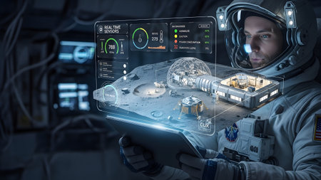 Astronaut monitors a futuristic holographic projection of an alien base with real-time data