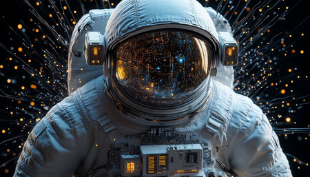A man in a space suit is looking at the camera. The image has a futuristic and adventurous mood