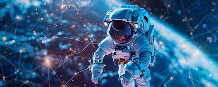 A man in a spacesuit is floating in space above the Earth. Concept of wonder and adventure, as the man is exploring the vastness of space