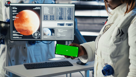 Astronaut monitoring system diagnostics on isolated screen smartphone during space mission. Teamworking cosmonauts using mockup mobile phone during cosmic expedition