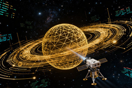A satellite is depicted in orbit above a planet. The composition features a low-angle perspective, with the celestial body illuminated by the sun's light. The image exhibits a cinematic style, suitable for various applications related to technology or space exploration, serving editorial and commercial goals.