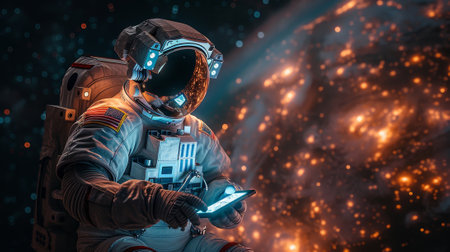 Astronaut in space suit and helmet working on tablet pc. Mixed media