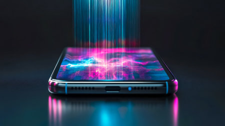 An iphone with glowing blue lights on the screen. Generative AI.