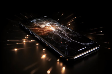 This captivating image showcases an explosion of sparks emanating from a smartphone screen, set against a dark backdrop, evoking energy and innovation.