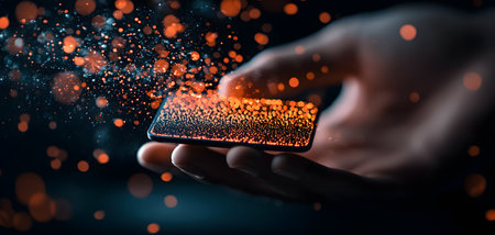 Hand holding illuminated mobile phone, working indoors with wireless technology generated by artificial intelligence