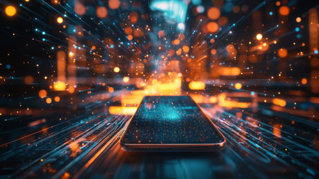 A striking image of a smartphone displaying a bustling city at night, with vibrant bokeh effects creating an exciting atmosphere, ideal for themes of technology and urban life.