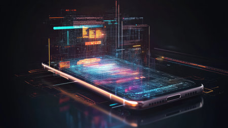 Smartphone with holographic interface projecting instant messages, icons and digital tools on sleek futuristic surface