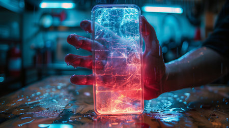 Hand holding illuminated smart phone, close up of touch screen technology generated by artificial intelligence