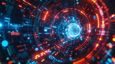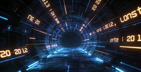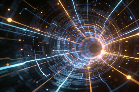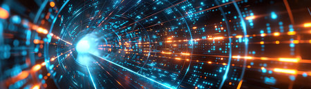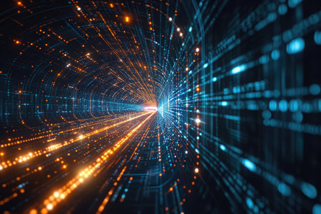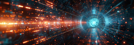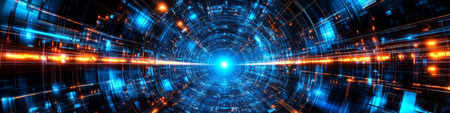 Futuristic digital tunnel with glowing lights, conveying a sense of technology and innovation in a vibrant blue and orange color palette