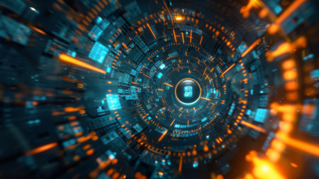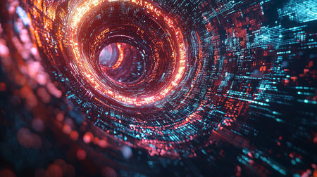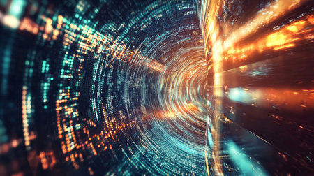 Eye-catching digital abstract image depicting a swirling tunnel of data, with vibrant orange and blue hues creating a sense of motion and depth.
