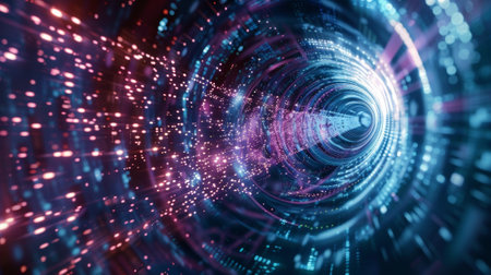 Discover a mesmerizing digital tunnel filled with glowing particles and dynamic light streaks. This captivating image evokes speed and motion in a surreal, dark space.