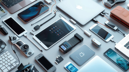 A collection of devices including tablets, smartphones, and accessories is displayed in a futuristic arrangement, highlighting cutting-edge technology and design.