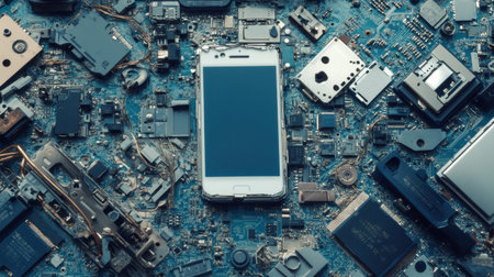 This image features a smartphone surrounded by various electronic components on a detailed blue circuit board, illustrating technology and innovation.
