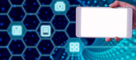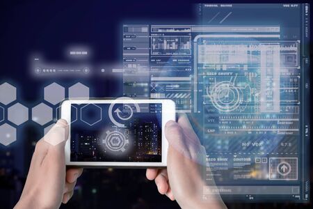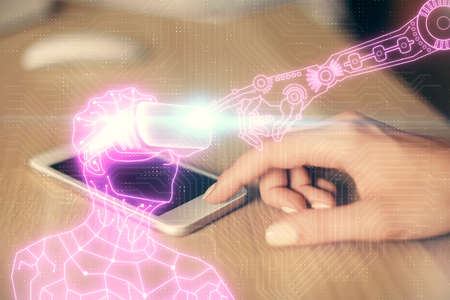 Double exposure of technology sketch hologram and woman holding and using a mobile device.