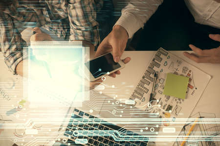 Double exposure of data theme hologram drawing and man and woman working together holding and using a mobile device.