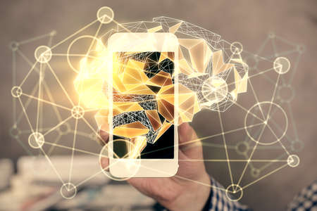 Double exposure of man's hand holding and using a digital device and brain hologram drawing. Data concept.