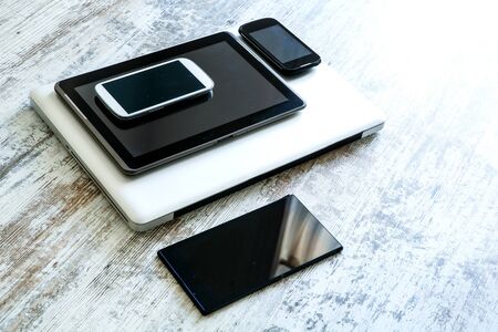 Smartphone with a lot of different electronic devices on the table.