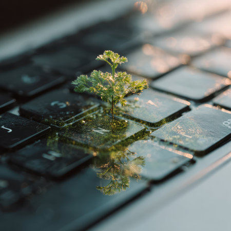 A close-up captures a laptop keyboard where small plant life thrives, reflecting the vibrant greens of nature. This serene workspace aesthetic blends technology and organic beauty harmoniously.
