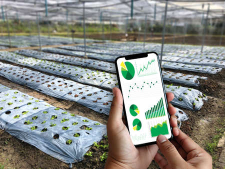 Hand holding smartphone,Organic farm background,agricultural product control technology and agriculture futures trading world market