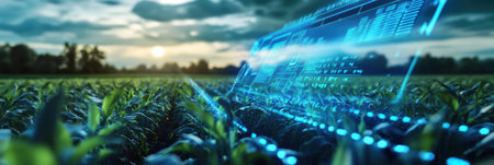Holographic technology presents crop yield data above lush farmland, featuring glowing blue elements that harmonize with the natural environment at sunset.