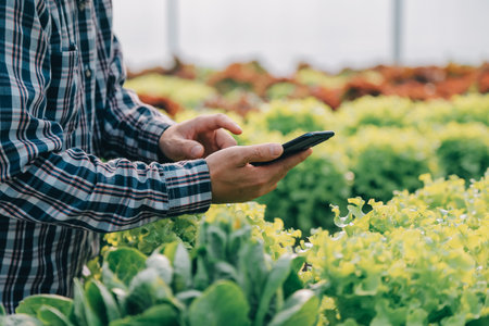 Smart farmer using digital tablet in hydroponic greenhouse with robot arm