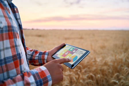 Precision farming. Farmer holds tablet using online data management software with maps, charts at wheat field. Agronomist working with touch computer screen to control and analyse agriculture business