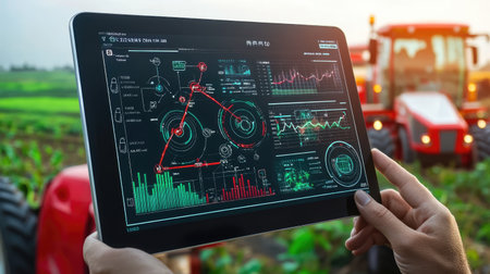 A digital farm dashboard on a tablet, showing real-time data on crop health, irrigation, and weather predictions.