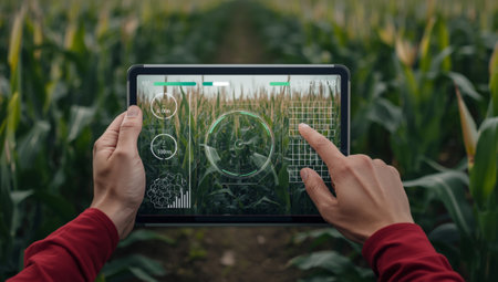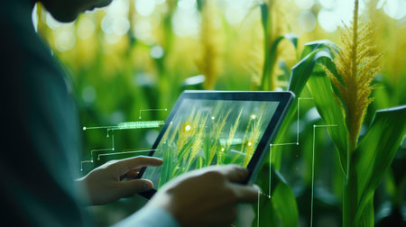 Hands hold a tablet displaying data while standing in a cornfield. The sun shines down as fields of corn stretch towards the horizon, showing modern farming technology in use.