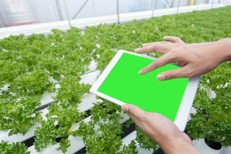 Mockup digital tablet blank green screen, hands holding tablet empty display use for application information and advertise with organic vegetable farm background.