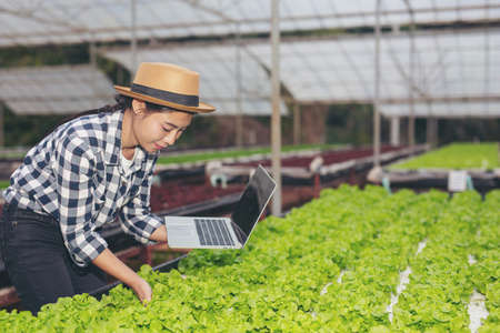 Asian woman farmers using mobile working in vegetables hydroponic farm.