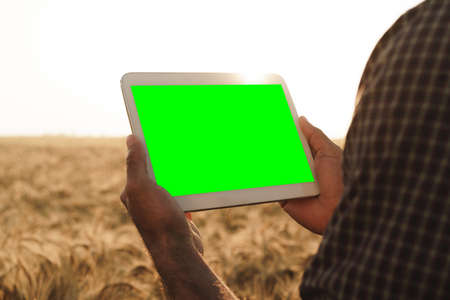 agriculture technology concept man Agronomist Using a Tablet in an Agriculture Field read a report